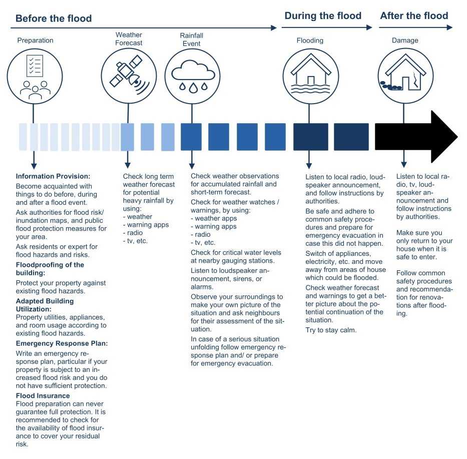 There are sources of information residents should seek for their own precaution. However, the availability of such information depends on the country or regions residents are located. Therefore, residents are advised to ask their local authority for available information. Common sources of information are shown below and put into a temporal perspective, i.e. before-, during- and after a flood.