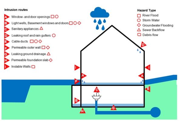 Generally, flood damages occur when water is able to enters the house/building. There are common routes of water into a building, which are shown in the below figure, and linked to their specific flood hazard type. As a general rule, floodwater first enters the building through low-lying openings, such as basement windows and doors, shafts and light wells, as well as through doors and window at ground floor if water levels are high enough. Even if openings are not present, seepage through the walls, cannot be ruled out, depending on the building- and material quality and length of flooding.